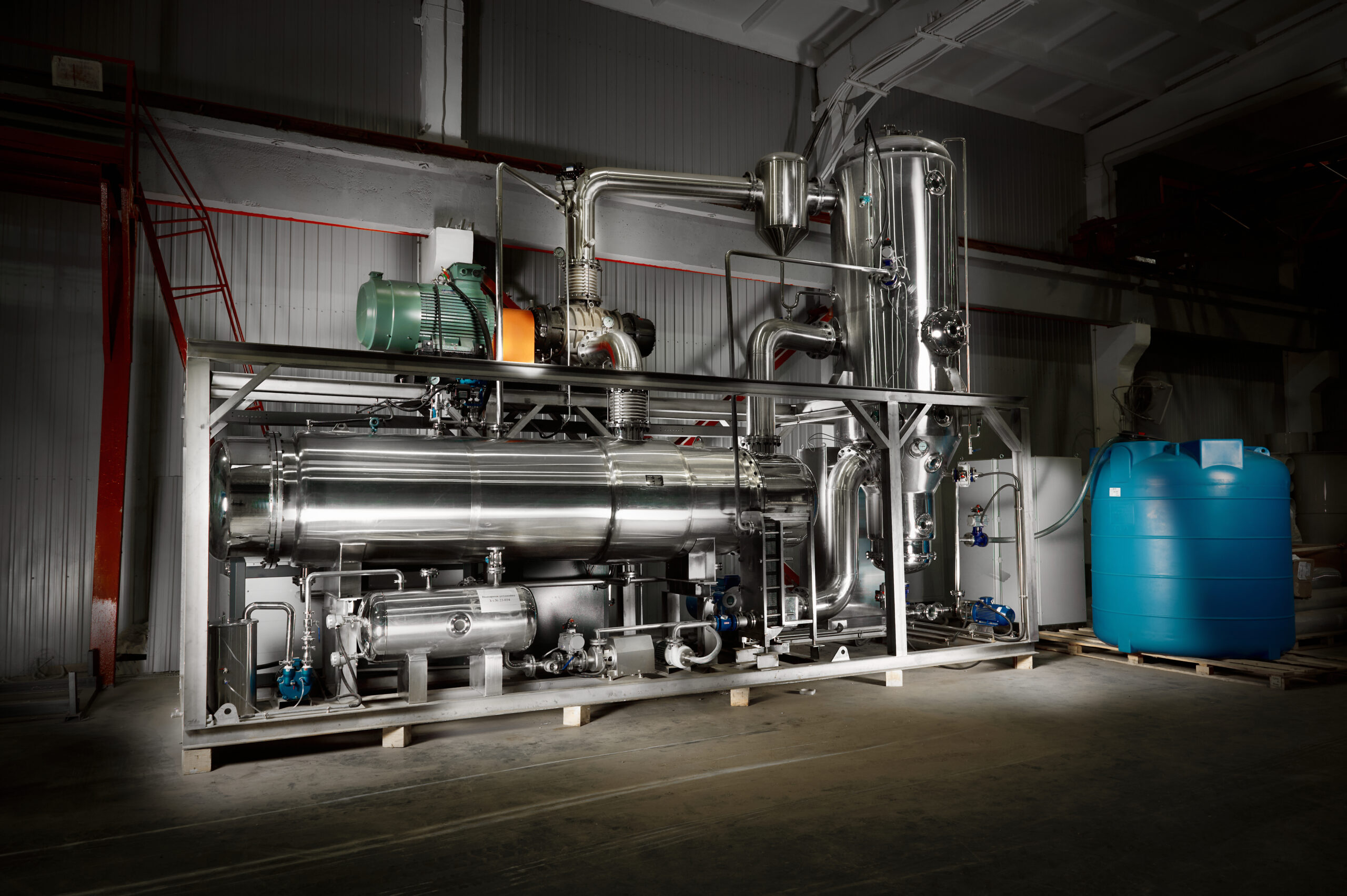 Выпарная установка производительностью 1250 кг/час предназначена для концентрирования водных растворов путем выпаривания солевого раствора и получения дистиллята.